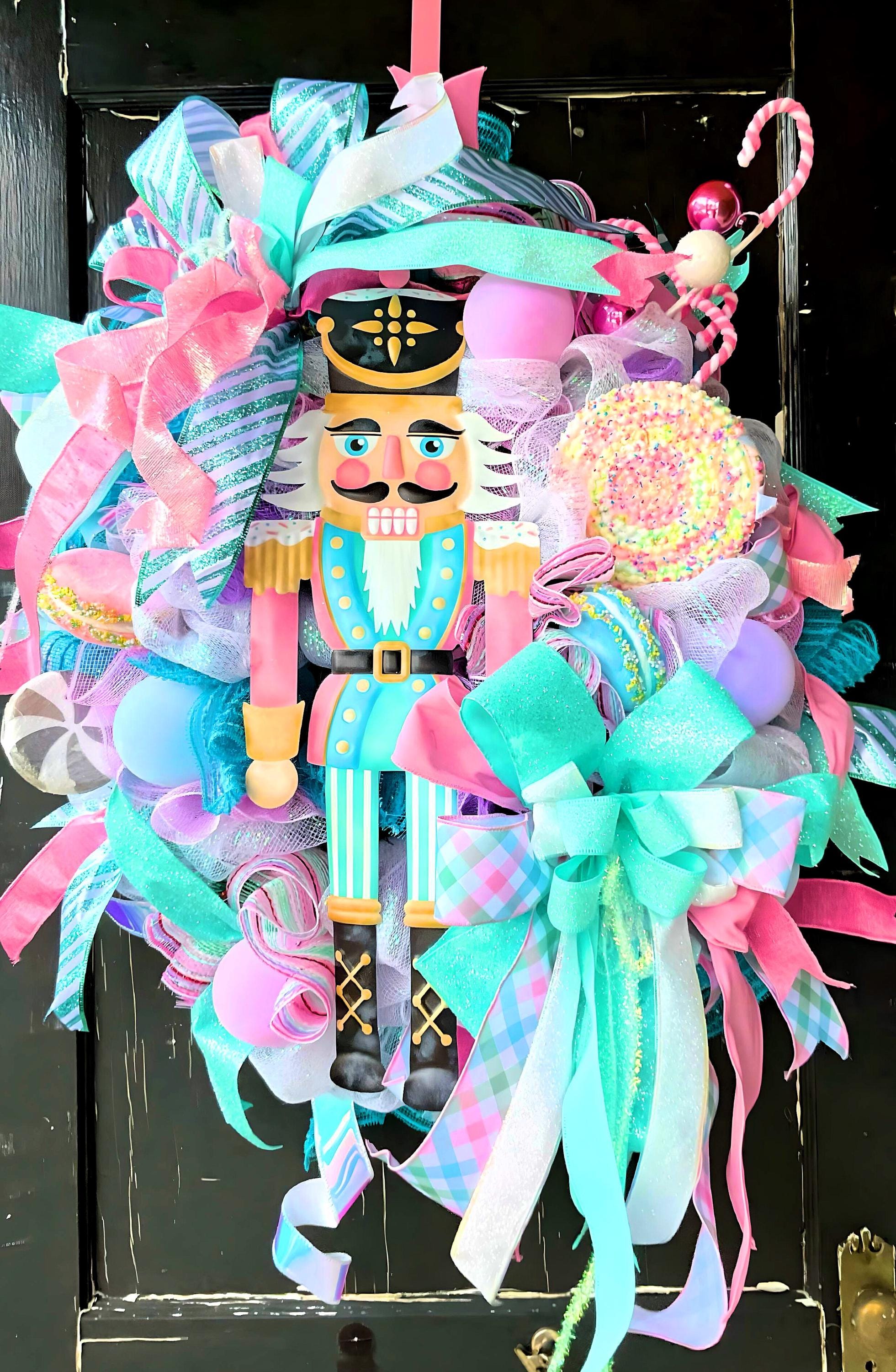 Pastel Nutcracker Christmas Wreath: Candyland Holiday Door Decor