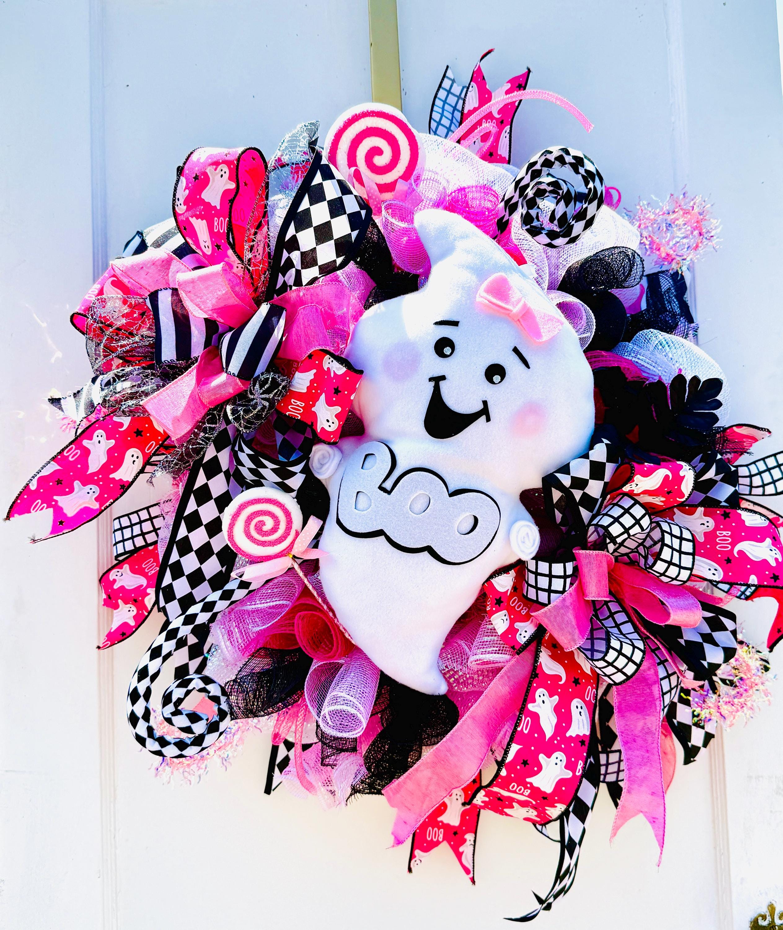At the heart of this stunning wreath is a plush, friendly ghost with rosy cheeks, a sweet smile, and a chic pink bow. Floating over a fun "BOO" design, this ghost is nestled in an explosion of premium ribbons and sparkling deco mesh. You'll love the mix of patterns—from playful pink ghost prints and bold black-and-white harlequin checks to classic stripes and shimmering black accents.